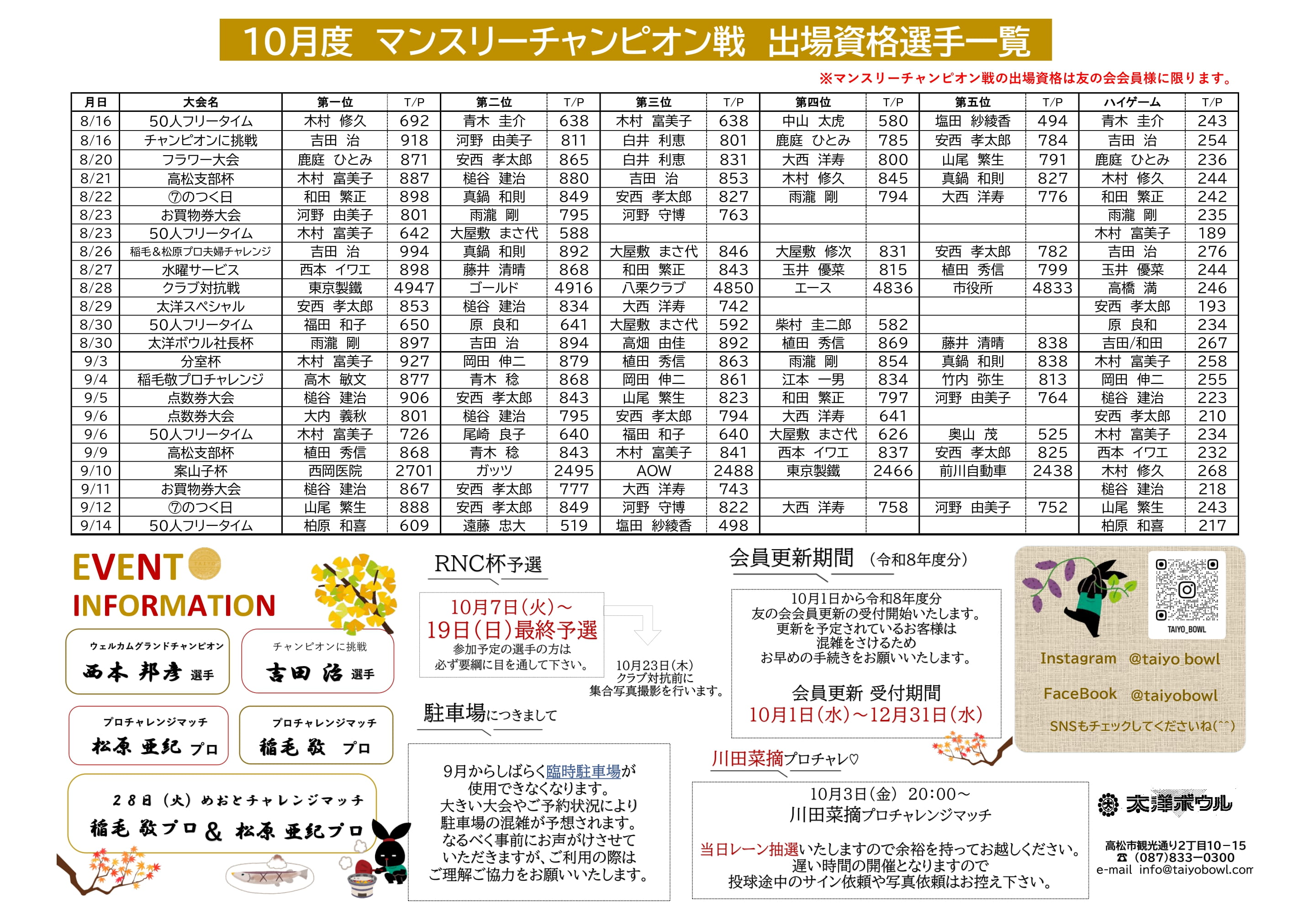 - ◆10月度マンスリーチャンピオン戦出場資格選手一覧をアップしました。詳しくはこちらをご覧ください。NEW