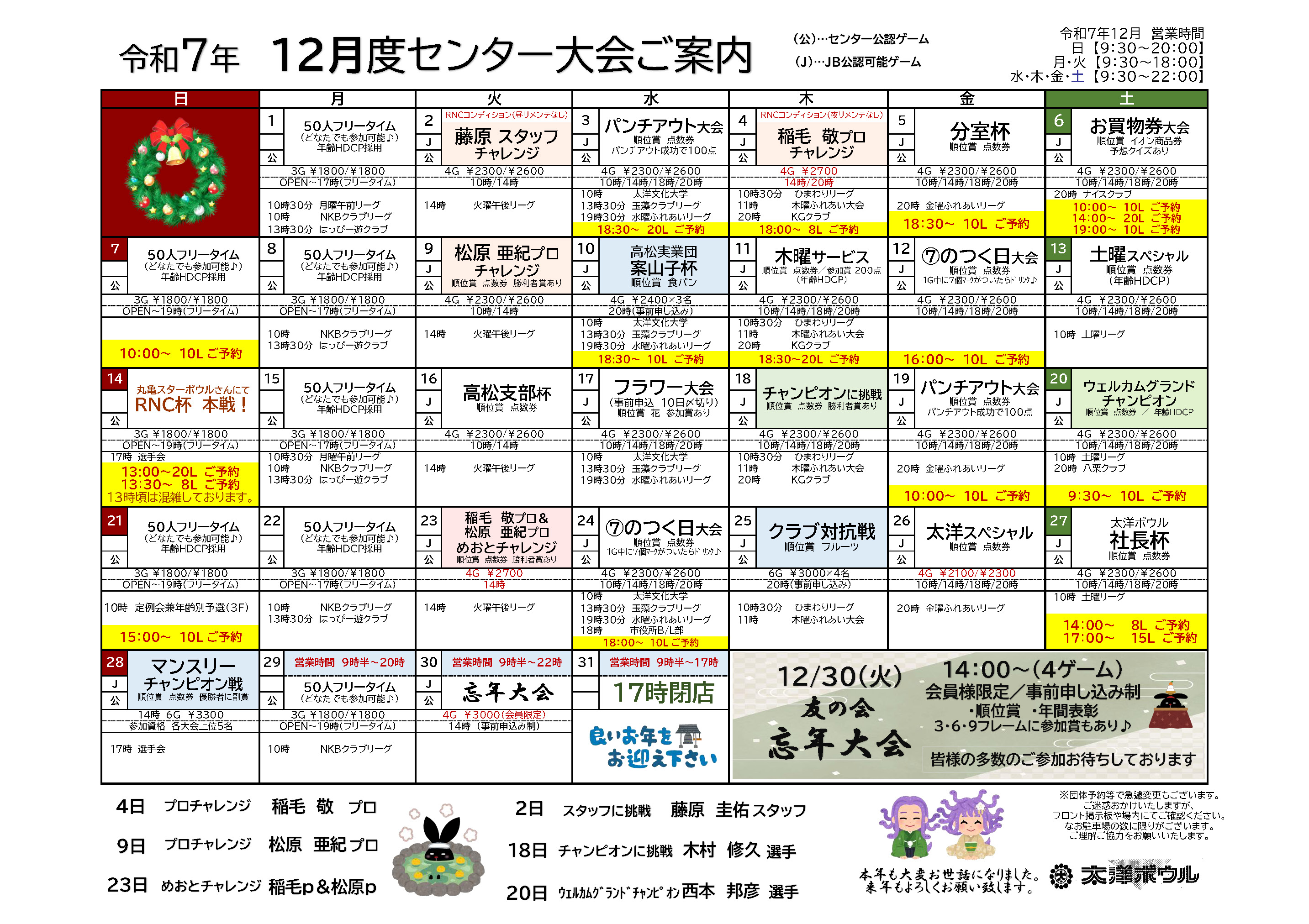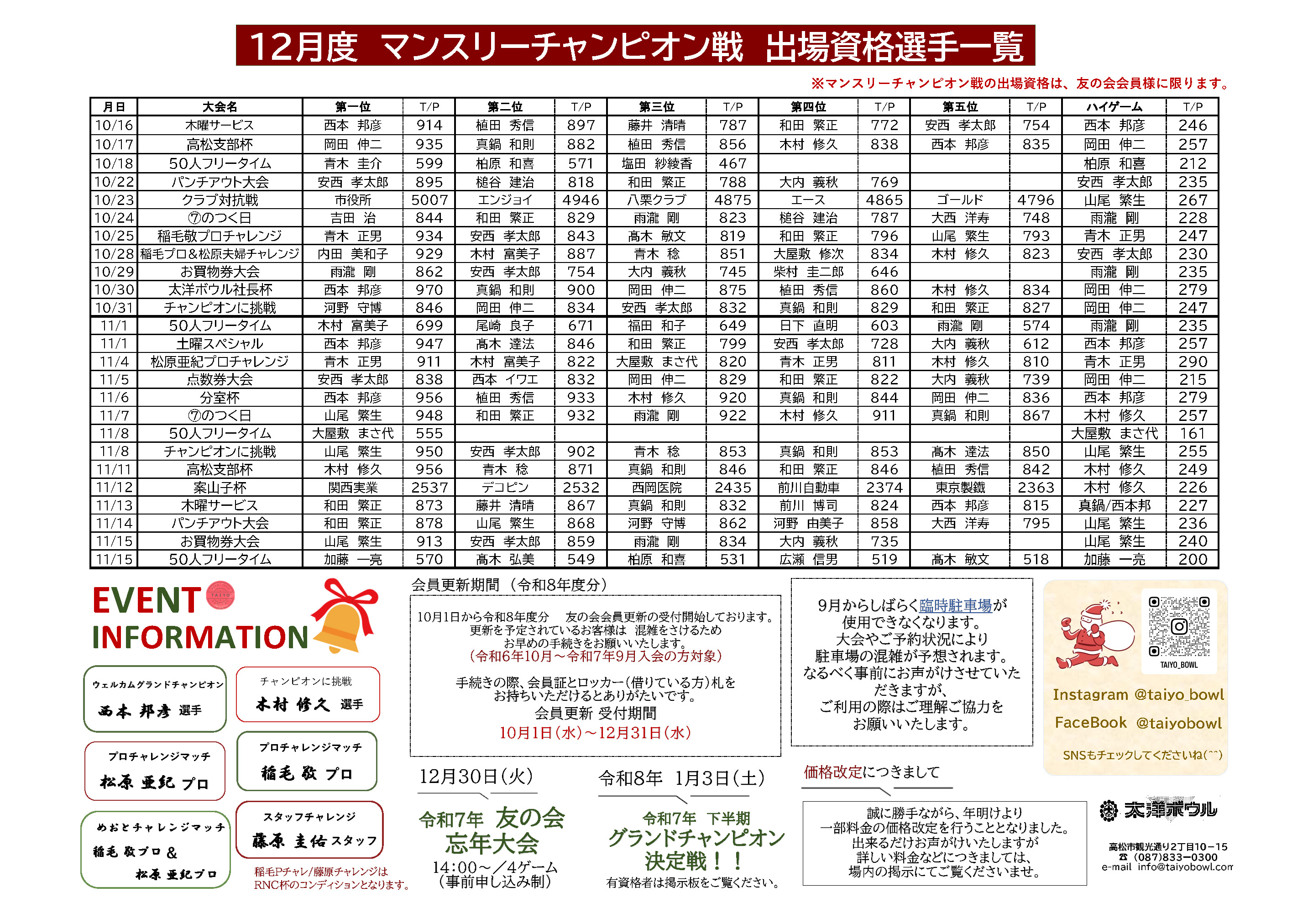 - ◆12月度マンスリーチャンピオン戦出場資格選手一覧をアップしました。詳しくはこちらをご覧ください。NEW