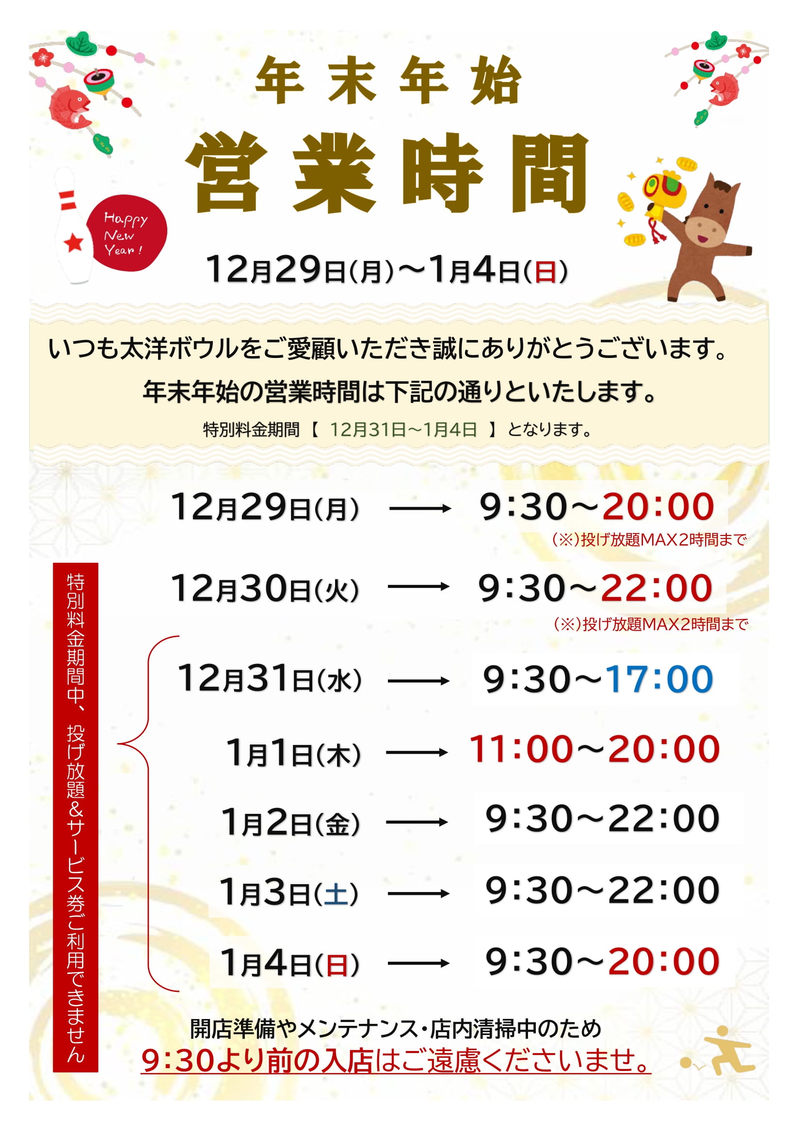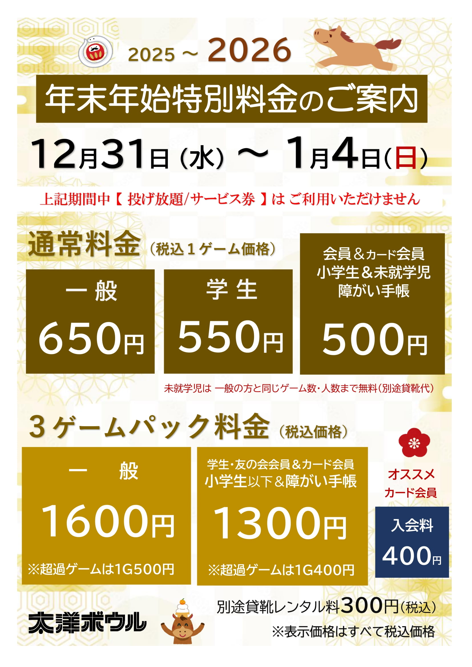 | 必ず、ゲーム前にカウンターにてお伝えください。 ※ゲーム途中にパックへの変更はいたしかねます。 ●貸靴代は、別途300円(1足)必要です。 |