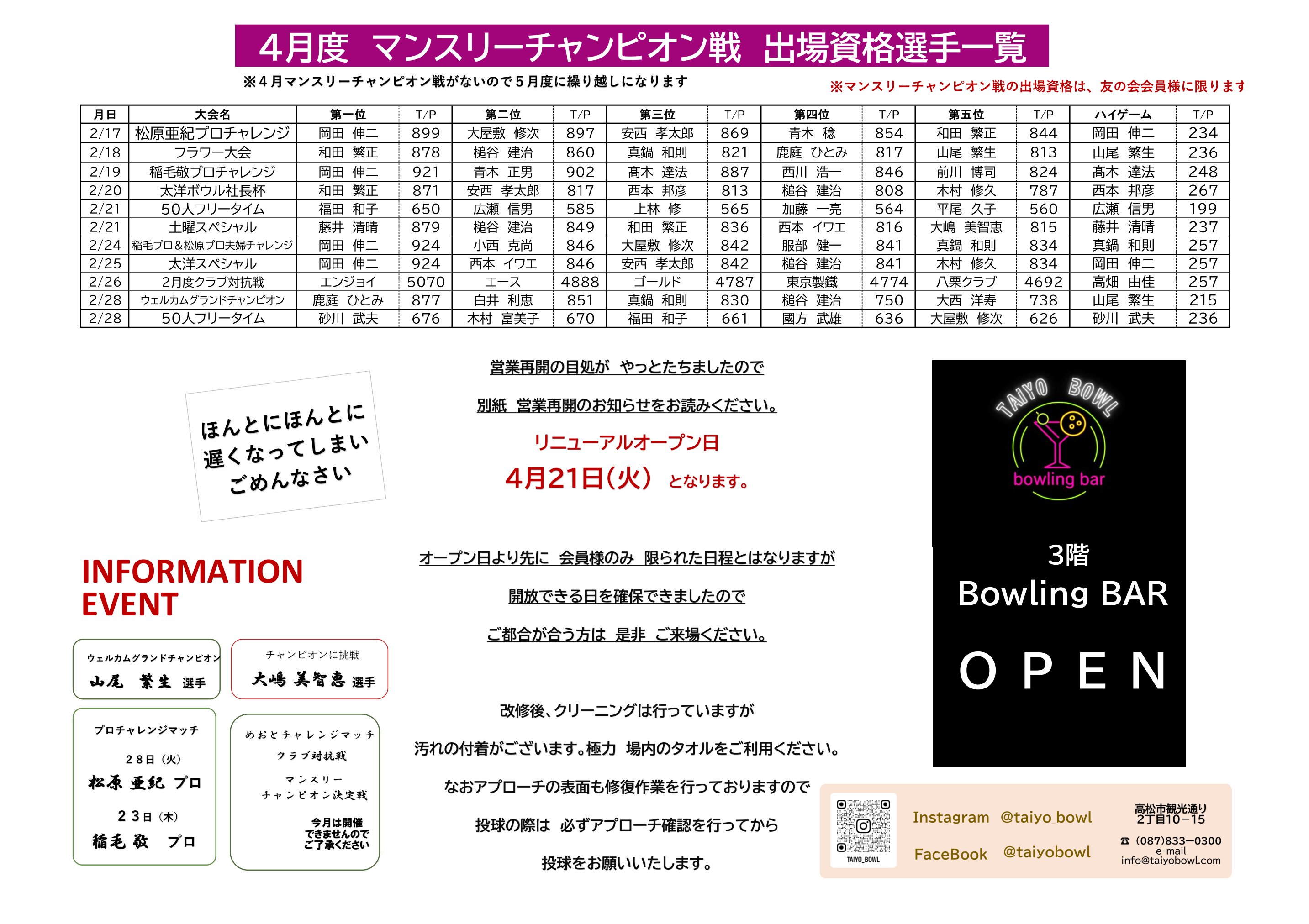 - ◆4月度マンスリーチャンピオン戦出場資格選手一覧をアップしました。詳しくはこちらをご覧ください。