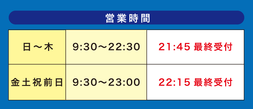 - 重要)7/1〜19の定休日は、月曜日、火曜日、営業時間は、水・木・日は9時〜20時、金・土は9時〜22時となっております。ご了承よろしくお願いいたします。