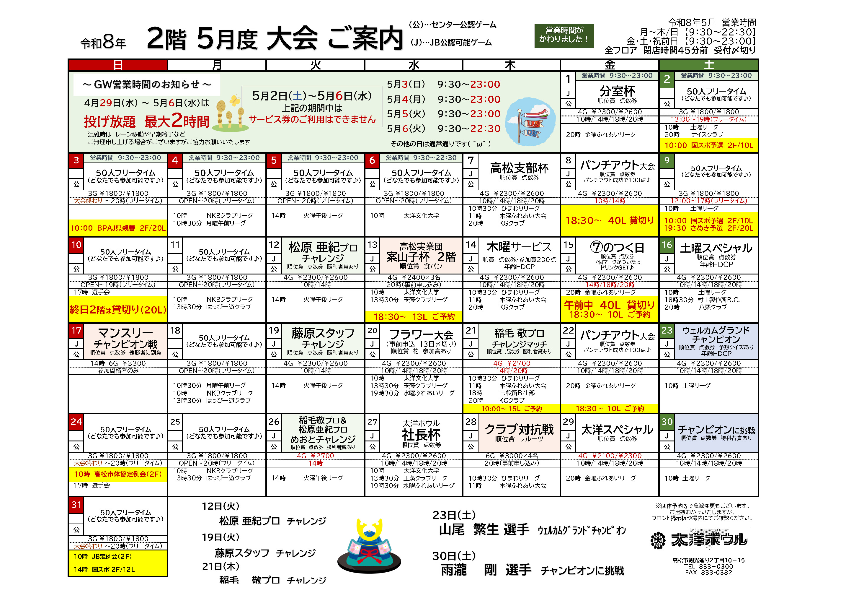 - ◆5月度マンスリーチャンピオン戦出場資格選手一覧をアップしました。詳しくはこちらをご覧ください。